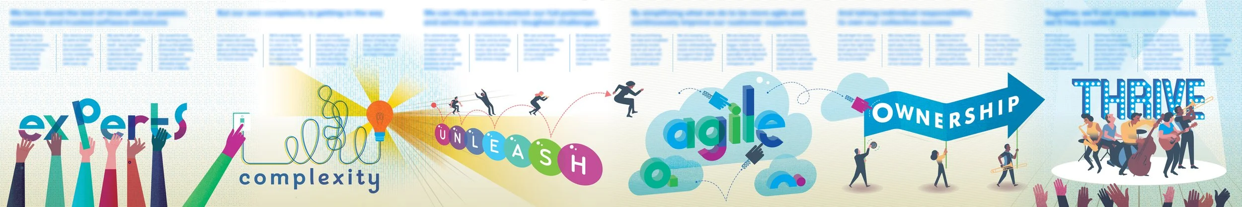 The Storytellers take their clients on strategic programs of change. To illustrate this journey, a unique creative solution is developed. Most often the ‘hero image’ comes in the form of a long wide story map with 6 ‘chapters’, each chapter representing a stage of the journey.